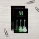 Professor de música de guitarra legal e cartão de visita personalizado de músico com modelo de foto. Legal ilustrações translúcidas de guitarras elétricas semicromáticas semicromáticas verdes sobre fundo preto, completas com monograma personalizado, nome, detalhes e modelo fotográfico. A música moderna tematizou o cartão de visita de fotografia para guitarristas, músicos profissionais, artistas, compositores e professores de música. Arte original da artista Catherine Sweetman