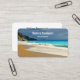 Cartões de visitas com uma bela fotografia com um mar azul de turquesa e uma praia arenosa com montanhas no fundo.