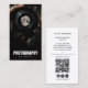 Elevem sua imagem profissional com nossos Cartões de visitas de fotografia na moda. Este cartão de visita moderno personalizável é perfeito para fotógrafos que querem uma impressão duradoura. Ele tem um design atraente com um código QR proeminente, e os clientes potenciais podem facilmente pesquisar e acessar seu portfólio on-line, informações de contato e perfis de mídia social.