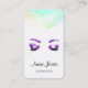 Um cartão de visita com uma bela ilustração pintada com aquarela. Bonito olhos roxos e sobrancelhas, olhos fechados mostrando longas e elegantes pinceladas. Uma borda abstrato ao longo do topo com cores verdes, azuis e cor-de-rosa irregulares.