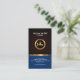 Um cartão profissional, criativo moderno. Simples e impressionante. O design é dividido em duas parcelas que é delimitado por uma tira do ouro. O design de madeira escuro superior da grão abriga seu nome, posição e um logotipo do ícone do ouro do falso; É um design de um torneira de água. Se você decide carregar uma foto, as medidas são o pix 1.000 x 1.000. Debaixo disto, azul brilhante na parcela colorida, são seus detalhes do contato e uma opção do slogan