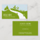 © Sunny Mars Designs. Modelo de Cartão de visita de paisagens verdes, brancas e azuis claros - ilustração do vetor de um campo verde com árvores, plantas ornamentais e uma via ou estrada. Perfeito para paisagistas, jardineiros, empreiteiros de serviços de jardinagem e serviços de corte de terras.