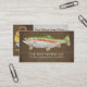 Barco vermelho de pele escura e russo Guia de pesca de madeira Lake Charter Cartão de visita design. O fundo de conselho de madeira DR. S. solta, de forma útil, a elegante truta arco-íris pintada a aquarela, o creel de pesca e os lures. Para as empresas de pesca russa ao ar livre, de lago de montanha ou de correntes, tais como serviços de orientação, compradas de combate, compradas de isco e serviços de aluguer de embarcações. Esta trabalho de arte foi criada por uma artista e designer de produtos com licença internacional, Audrey Jeanne Roberts, copyright.