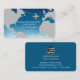 Belo cartão de contato para se promover com elegância... frente: mapa de cinzas pálidas do mundo e um avião de ouro falso, nome e profissão (guia turístico, agente de viagem...) e slogan personalizado (aqui vamos nós novamente); verso: linhas de texto (nome comercial, telefone, email e endereço) em fundo azul-céu com logotipo da empresa.