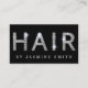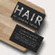 Cartões de visitas elegantes para penteados apresentam 'CABELO' em cor prateada cheia de ícones de diamante , em um fundo preto com uma linha de texto personalizado em cor prateada. Adicione seus detalhes à parte traseira do cartão. O fundo no verso é preto e o texto está na escrita prateada moderna.