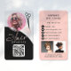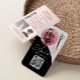 Cartões de visitas verticais elegantes e modernas para penteados apresentam um script de tipografia de tendência ''hair'', quadro de dentro de fotografia de solteiro redondo, logotipo de tesoura de penteado com elemento floral rosa pincelado, código qr e seu nome em fundo preto e branco. Personalize ainda mais com seus detalhes de contato, 2 fotos adicionais e detalhes das mídias sociais no verso.