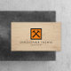 Um logotipo de martelos de interseção em uma caixa moldada em laranja é combinado com seu nome ou nome comercial para uma estética profissional neste modelo de cartão de negócios projetado para o homem de mão, carpinteiros, empresas de construção, etc. Configurado em uma imagem de fundo de madeira para uma aparência utilitária. © 1201AM CREATIVE