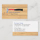 Cartão de visita de um homem de aparência inteligente com martelo, nome e ocupação em tábuas de madeira com texto azul e preto. A parte traseira tem fundo branco com texto azul e preto e informações de contato.