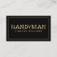 Cartão de visita moderno e mínimo de Handyman. Este elegante design apresenta o script de tipografia ''handyman'' em fontes de ouro de moda com ferramentas e seu nome em fundo preto. Personalize ainda mais os seus contatos no verso.