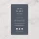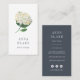 Os cartões de visitas verticais elegantes para floristas, designers florais, planejadores de casamento ou outros profissionais de casamento apresentam uma ilustração de cor d'água hydrangea blossom em verde e branco, com seu nome ou nome comercial embaixo. Adicione seus detalhes de contato do cheio ao lado inverso em branco em um fundo azul do enfumaçado em contraste. Inclui três ícones de mídia social e um campo de modelo para o seu identificador de mídia social.