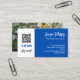Cartão de visita branco, preto e azul para qualquer profissão com suas informações de mídia social na forma de seu código QR pessoal e, no verso, uma foto. Cartão de visita de criador de conteúdo com um encantador script de pincel, cor azul de sotaque, ícones fofos nas mídias sociais e seu código QR.