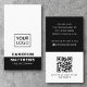 Cor preta, branca ou personalizada, design de cartão de visita profissional moderno com campos modelo para nome, nome/cargo da empresa, logotipo (foto ou outro gráfico), código QR e informações de contato, incluindo ícones das mídias sociais. Alterar as cores de fundo, mover e redimensionar elementos com a ferramenta de personalização.