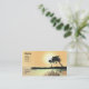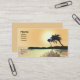 Cartões de visitas com meu design de cena tropical com uma ilha e palmeiras silhuetadas contra um céu amarelo.