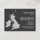 Um cartão de visita com um mapa das Ilhas Britânicas. Detalhes da empresa na frente com nome e detalhes de contato no verso em um estilo tom em contraste com a frente.