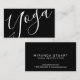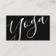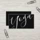 Cartão de visita de instrutor profissional moderno de preto e branco com a palavra "yoga" no estilo de letra da caligrafia moderna no lado frontal e detalhes no estilo de letra sans moderno no lado traseiro.