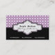 Bolinhas branca roxa preta, com cartão de visita de, com um padrão de bolinhas roxo e branco. A parte inferior é de cor preta sólida. Uma faixa preta e roxa separam as duas partes. Sua empresa/nome é digitado em uma etiqueta elegante de umbragem com contorno preto e roxo. Design bonitinho, moderno, com um retrato, que pode ser usado para muitas áreas de negócios como interiores, cabeleireiro, salão de beleza, salão de unhas, cosmetólogos, decorador, terapeuta, artesanato, moda, maquiagem e muito mais.