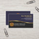 Um design requintado com uma onda falsa de ouro montando em um azul elegante e cinzas se expandem. No canto inferior esquerdo, encontra-se um logótipo dourado falso com o nome da empresa e o tipo de serviços oferecidos ; Mude isso para atender às necessidades de sua empresa. Em direção ao topo estão o seu prestígio nome e cargo, seguido dos detalhes do contato.