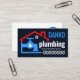 A dark blue cover features a home building frame that is leaking water from the faucet. Card details are over on the right with your prestigious name in blue at the top corner. This is followed by the business name "plumbing" and a slogan caption option which you can change.