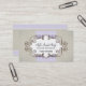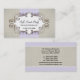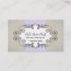 Este cartão de visita doce do Lilac e das bolinhas evoca a doçura de seus elementos gráficos à paleta de cores. O fundo é taupe com uma folha de prova do teste padrão de ponto. O nome da empresa, a descrição, e o contato principal estão para fora em um quadro ornamentado com curlicues. O reverso revela o mesmo fundo com o resto da informação do negócio com o elemento scalloped roxo que limita na parte superior e na parte inferior. Aproprie para um negócio alinhado ao setor feminino, um estabelecimento da comida que se especialize em deleites doces ou em um boutique. Disponível em cores alternativas com produtos de harmonização.