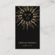 Um cartão de visita etéreo celeste com uma mandala de ouro moderna, com raios solares, e fases da lua, a preto, com uma assinatura bonito e moderna. Adicione seu título.