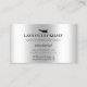 O brilho de fole fina de platina e um gradiente holográfico simulado em prata metálico usaram o tom para este modelo de cartão de negócios personalizável, com pálpebras representadas inteiramente cobertas com pincel de prata de platina a brilhar.