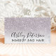 Um elegante artista moderno, na moda, maquiador, cartão de visita de cabeleireiro com elegante estilo de letra simples, em branco, num brilho lilás roxo, falso lavanda, tendência de mármore branco e fundo elegante. todo o texto é personalizável, adicione as suas mídias sociais.