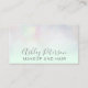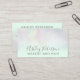 Um elegante cartão de visita de artista moderno, na moda, com elegante estilo de letra simples e elegante, em um holográfico iridescente de nacre de pérola e verde-menta pastel e uma elegante história de fundo. todo o texto é personalizável, adicione a mídia social.