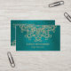 Uma jóia bonita tonificou a turquesa do verde azul do peackcock da cerceta e o cartão de visita do ouro com indiano exótico um sari decorativo inspirado como o teste padrão com uns lótus e um design floral do sunburst. Este cartão telefónico indiano de gama alta e luxe moderno elegante e bonito do estilo é perfeito para um instrutor da ioga, o terapeuta da massagem ou a toda a outra cura do profissional do corpo, da mente e do espírito. Os trabalhos de arte projetaram, direitos reservados e criaram por Chrissy H. Estúdio, LLC. Todos os direitos reservados.