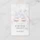 Cartões de visitas verticais elegantes para especialistas em lash, técnicos de sobrancelhas, esteticistas ou maquiadores apresentam um par de pestanas e sobrancelhas em folha de ouro falso rosa num fundo de mármore branco com duas linhas de texto personalizado em carvão escuro. Personalize a parte traseira com os detalhes de contato do cheio, mostrados abaixo de uma ilustração menor de lascas correspondentes.