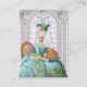Marie Antonieta de um lindo vestido de aqua está segurando um bolo de rico. O fundo é um antigo papel de parede em molho e uma videira maleável.