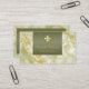 Um elegante cartão de visita de mármore verde e dourado com o logótipo da flor dourada de lis.