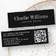 Mini cartões de visitas pretos elegantes com seu nome e informações de contato junto com um código QR.