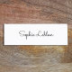 Um cartão de visita branco elegante e profissional, básico e claro com campos para nome (estilo de fonte do script de Sacramento), número de telefone e email para um primeiro contato na moda.