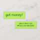 Um cartão de visita verde com a paródia "tem dinheiro?". Há outros tons de verde que funcionam bem com a imagem nesses cartões de visitas.