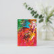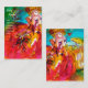 Uma mulher loira sofisticada está sentada com uma rosa vermelha e uma máscara de penas à mão com tecidos espumantes de ouro e fúcsia de ouro, de uma fantasia de bola mascarada barroca com penas e um cão. Pintura aquosa com cores brilhantes em amarelo, azul, rosa, verde, faíscas douradas e folha prateada, inspirada em personagens da Comédia de Arte (Commedia dell' Arte), Carnaval de Veneza e máscaras de penas venezianas.Este cartão legal e artístico é perfeito para cabeleireiro, na moda, maquiagem teatral, figurantes, designers de roupas, donos de teatro atrizes, modelos, cosméticos, cosmetólogos, perfume, compras pessoais, consultores de armários, designers de moda, moderna, indústria de entretenimento e outras profissões criativas.