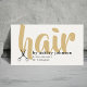 Modern elegant customizable business card template with golden brown handwriting fonts, black scissors icon. Perfect for beauty salon, hairstylist, hairdresser, barber.