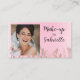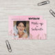 A chic and modern business card design for makeup artists and beauty professionals. This layout features a soft pink background with leaf accents and elegant script typography. Perfect for salon owners, bridal makeup artists, and beauty consultants seeking a stylish, professional brand identity. Add your photo, QR code and business information for a personal touch.
