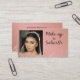 A chic and modern business card design for makeup artists and beauty professionals. This layout features a soft dusty blush pink background with leaf accents and elegant script typography. Perfect for salon owners, bridal makeup artists, and beauty consultants seeking a stylish, professional brand identity. Add your photo and business information for a personal touch.