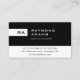 Cartão de visita preto e branco, profissional, moderno, simples e minimalista, com monogramas no quadrado esquerdo, nome do cheio seguido de carreira e detalhes do cheio no canto inferior e preto claro com monograma branco no verso.