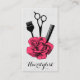 Um elegante, um vintage e um cartão de visita moderno com uma rosa vermelha grande em um fundo cinzento com um par de tesouras/tesouras, uma escova da cor do cabelo e um pente. Aperfeiçoe para hairstylists, cabeleireiros, hairstylists, armários do cabelo, cosmetologists, cosmetologia, salões de beleza, termas e mais!
