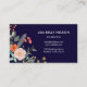 Um pulverizador colorido de flores botânicas gráficas decora este cartão de visita e pode ser personalizado com três iniciais do monograma na parte dianteira. O fundo é um azul marinho rico e o lado oposto guardara toda sua informações de contacto.