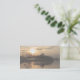 O sol da manhã mostra em silhueta árvores e ilumina remendos da névoa. O lago reflete o céu.