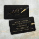 Cartão de visita de consultor notário certificado para tipografia moderna, com um elegante roteiro de caligrafia em ouro e canetas sobre um couro preto escuro, para um toque exclusivo de luxo.