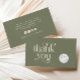 Cartão de inserção simples para pequenas empresas com um texto retrorreflector giro que diz "obrigado você". Você pode adicionar seu logotipo e uma mensagem simples no verso, juntamente com suas mídias sociais e informações do site. A cor está em verde sábio.