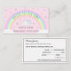 Um cartão de visita perfeito adorável para uma babá, guarda de crianças, especialista em cuidados infantis, creche ou babá. Num fundo cor-de-rosa para bebês, o design lê Hello Little One, sobre um arco-íris pastel multicolorido bonito. A carta é decorada com estrelas de cinza, nuvens brancas e uma lua doce e um gráfico em nuvem.