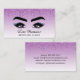 Faça uma boa impressão com este cartão de visita chic com gotas de brilho púrpura, uma ilustração de olhos roxos com sombra de olhos brilhando e sombras e pestanas dramáticas e seu nome em um roteiro contra fundo ombre roxo. Adicione suas informações de contato no verso. Perfeito para profissionais em salões de beleza, maquiadores, estilistas capilares, esteticistas e profissionais que prestam serviços de coleira e sobrancelha