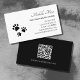 Pet Sitter code cartão de visita, com uma pata preta imprime design e elegante tipografia preta. Com texto personalizável, você pode adicionar suas próprias informações. A parte traseira tem uma cor preta e um código QR onde você adiciona seu site. Excelente para adicionar um toque bonito no seu negócio de serviços para animais domésticos.