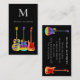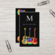 Cartão de visita de personalização do professor de violão moderno. Esse cartão de visita vibrante apresenta guitarras acústicas, semissacústicas e elétricas psicodélicas em um impressionante conjunto de cores contra um fundo preto impressionante. Completo com um monograma personalizado, seu nome, detalhes de contato todos rendidos na tipografia da na moda, este cartão é a introdução perfeita para tutores de guitarra, guitarristas, músicos profissionais, artistas e professores de música. Arte original de Catherine Sweetman.