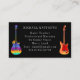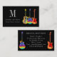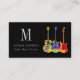 Na moda de moderno, professor de guitarra, cartão de visita personalizado. Esse cartão de visita vibrante apresenta guitarras acústicas, semissacústicas e elétricas psicodélicas em um impressionante conjunto de cores contra um fundo preto impressionante. Completo com um monograma personalizado, seu nome, detalhes de contato todos rendidos na tipografia da na moda, este cartão é a introdução legal e colorida perfeita para tutores de guitarra, guitarristas, músicos profissionais, artistas e professores de música. Arte original de Catherine Sweetman.