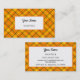 Cartões de visitas com um padrão retrorreflector de amarelo e laranja com faixas menores de castanho e verde em um cartão de visita editável com script e vintage e letras de script para seu nome e informações, tanto frente como verso.